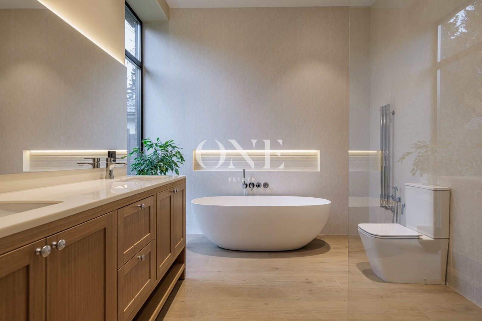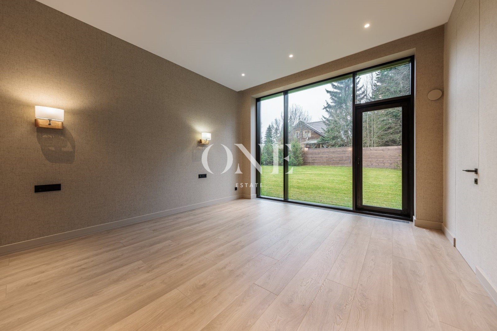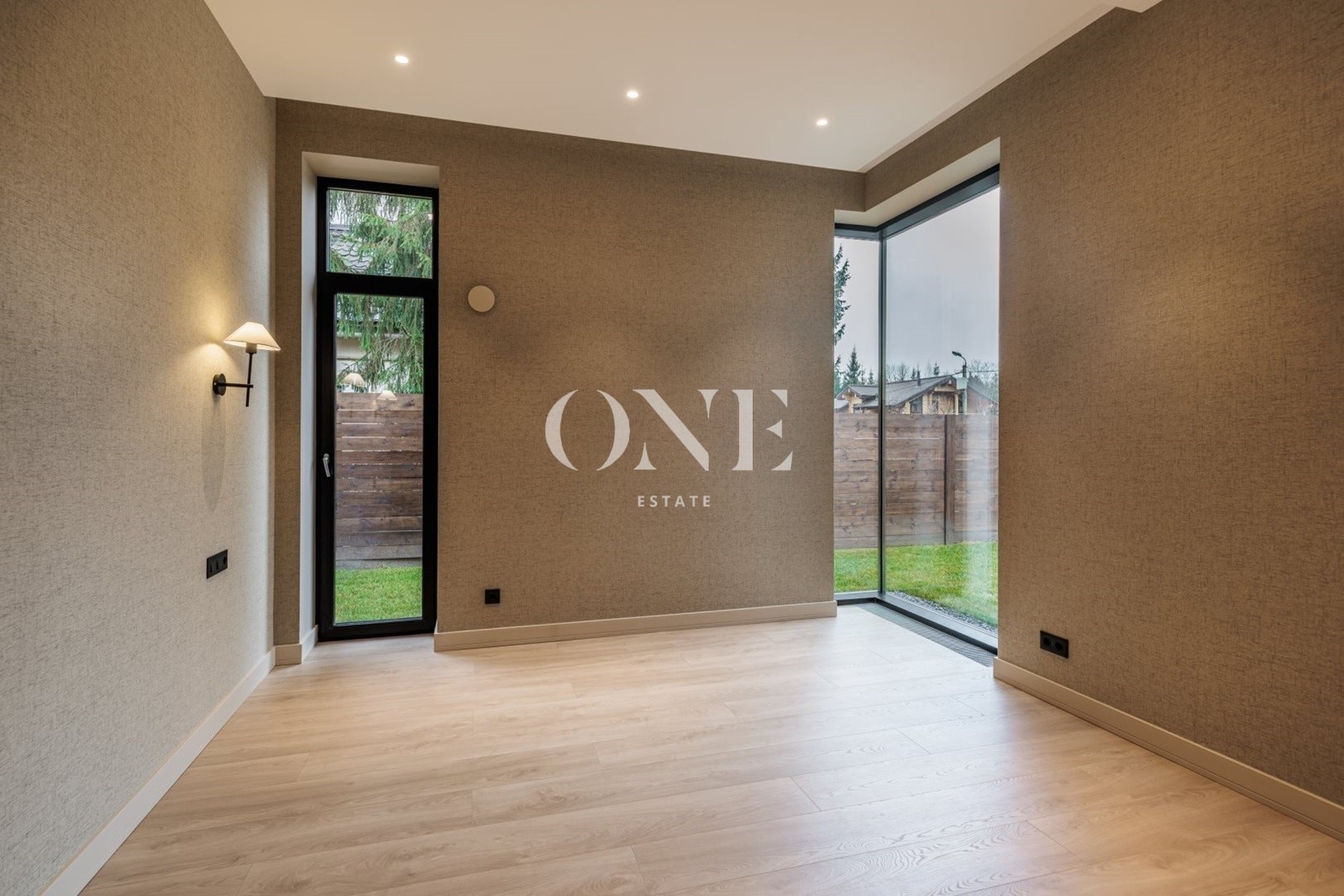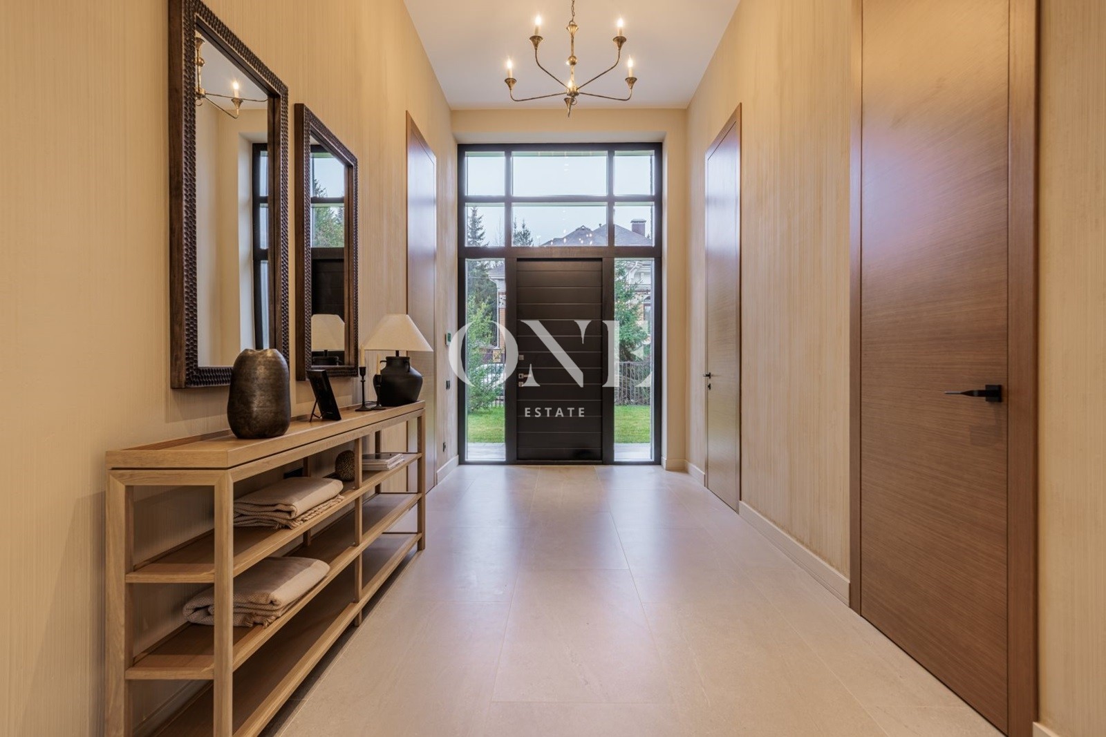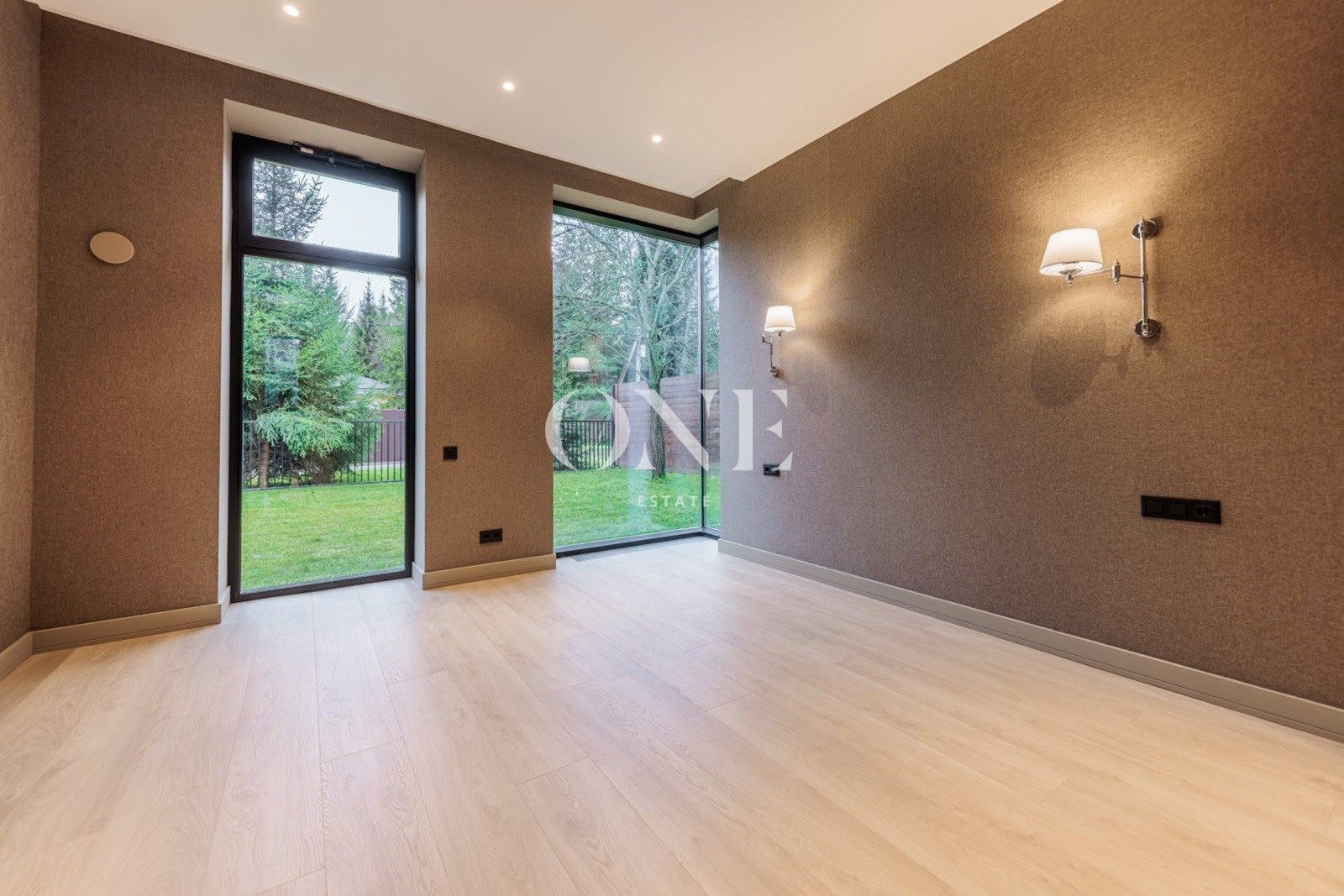 Алюминиевые окна Alutex высотой 3,6 метра, двойной энергоэффективный крупноформатный стеклопакет, площадь остекления фасада более 40%. В отделке использованы: межкомнатные двери высотой 3 метра (шпон дуба), плитка Porselanosa, Французские моющиеся краски Argile, текстильные широкоформатные обои в спальнях.