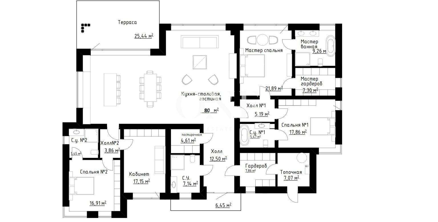 В доме 4 спальни, 3 из которых имеют свои с/у и гардеробные.