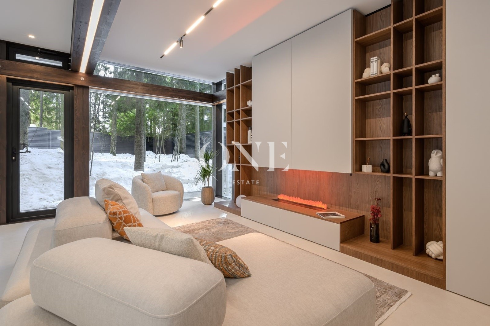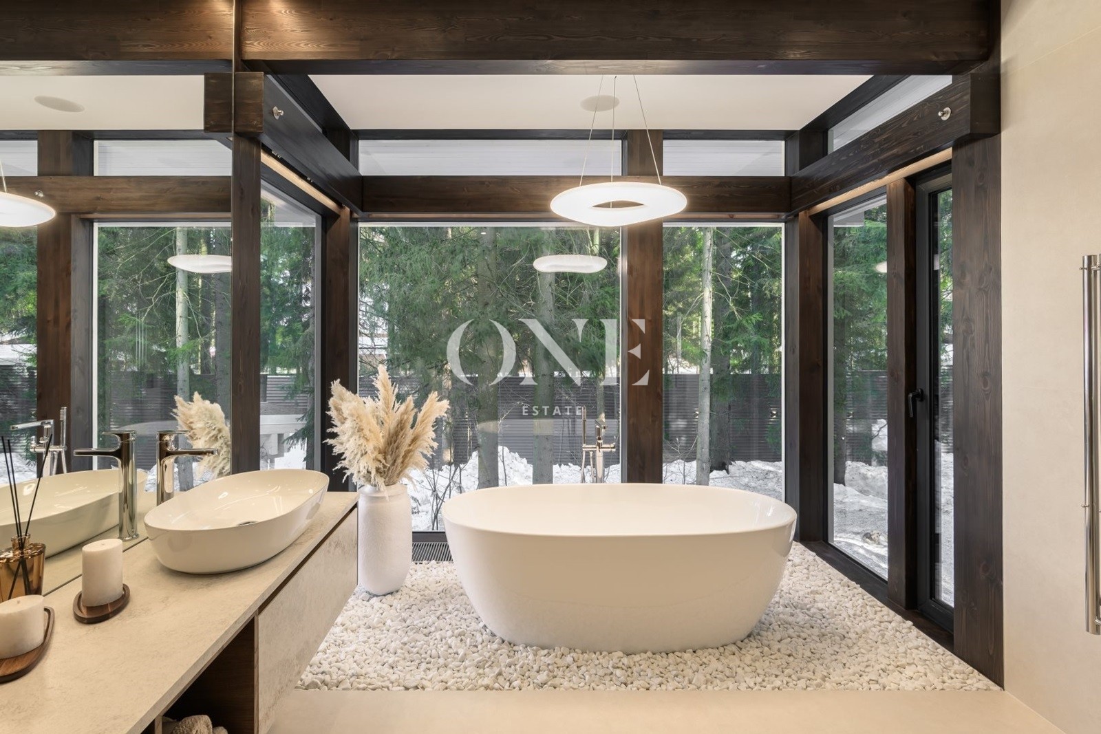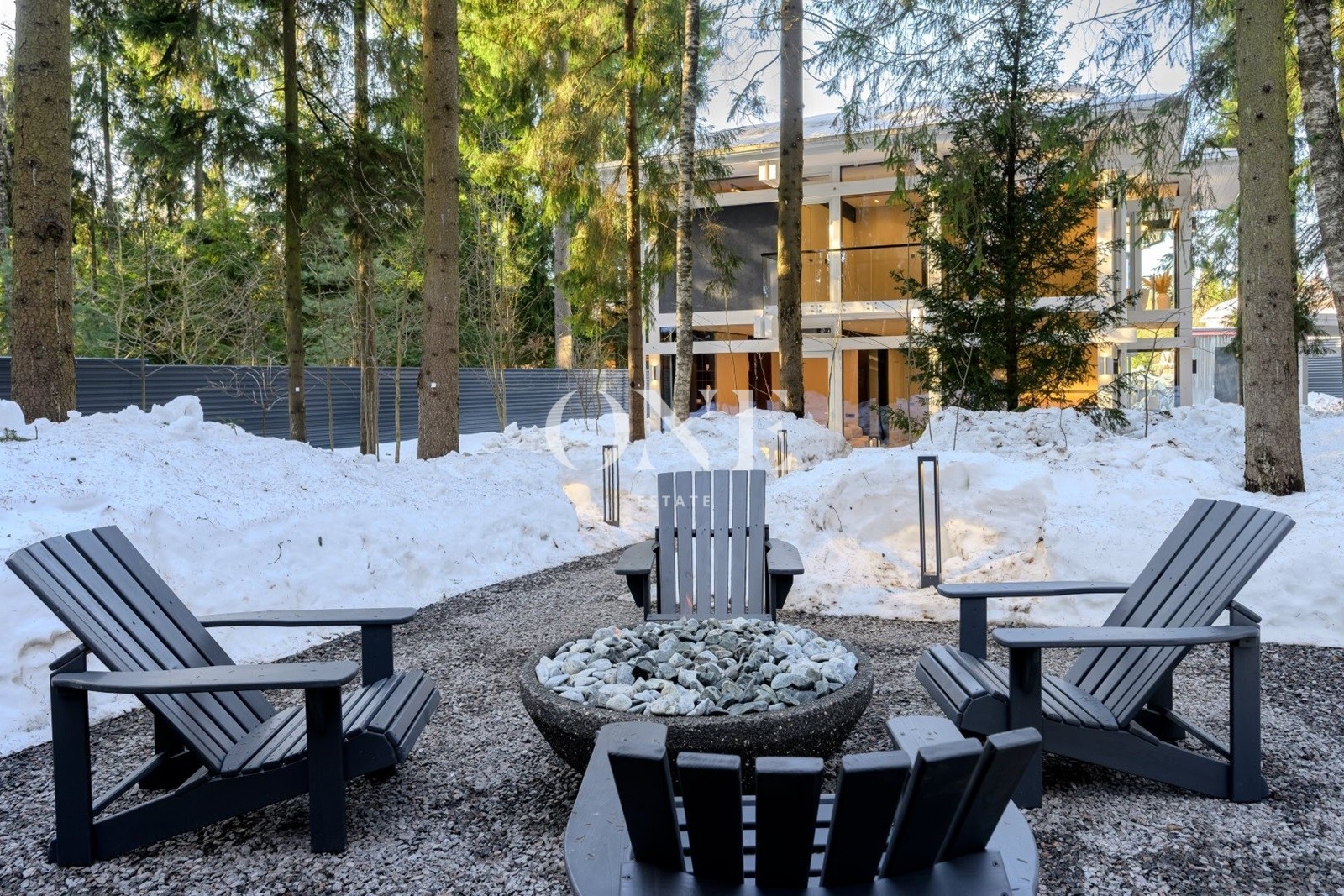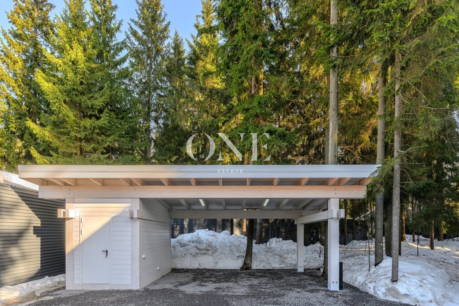 На участке 13 соток растут многолетние ели и дубы, оборудованы костровая зона, просторное патио с выходами из гостиной и кухни, праздничная иллюминация в лесу и декоративные