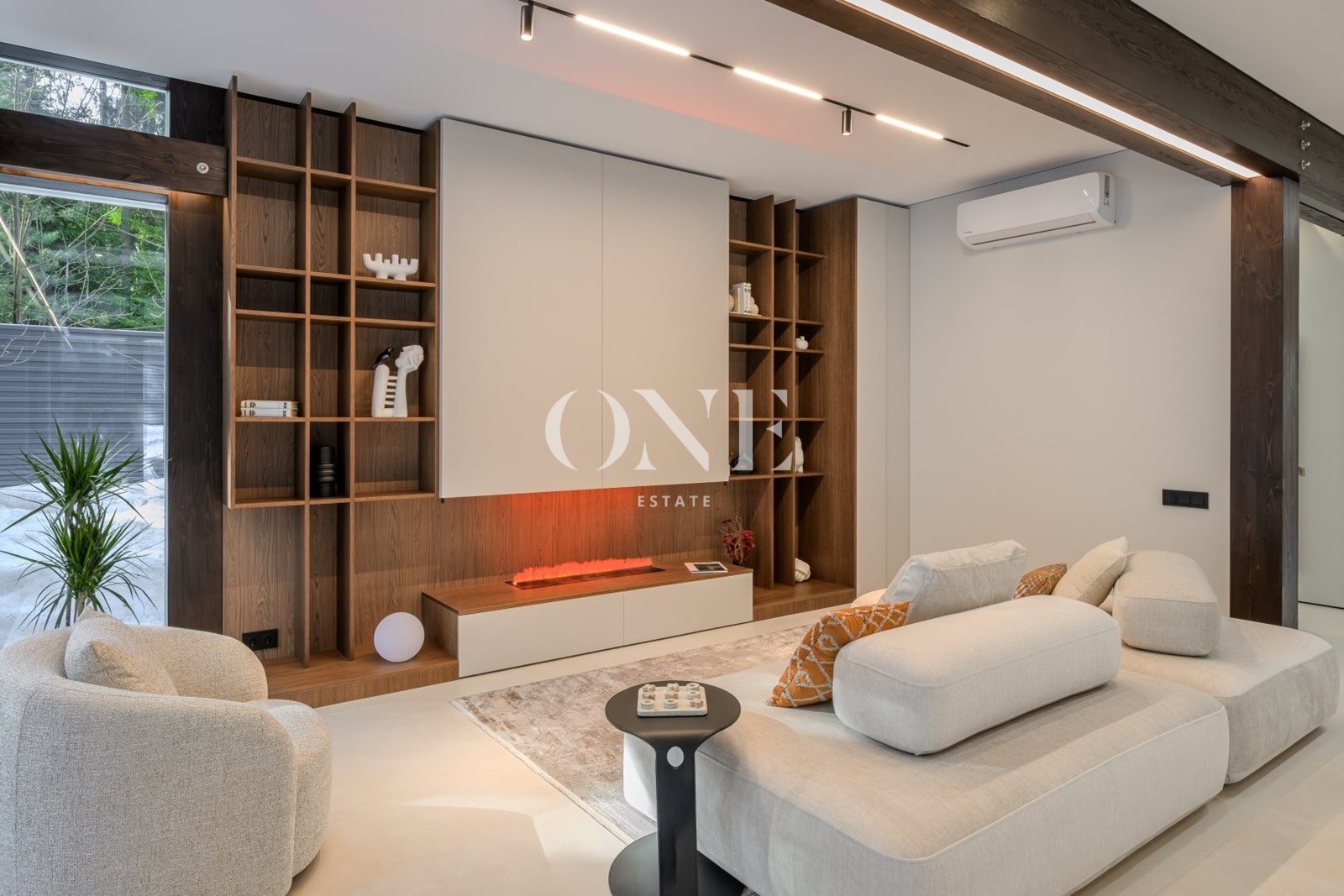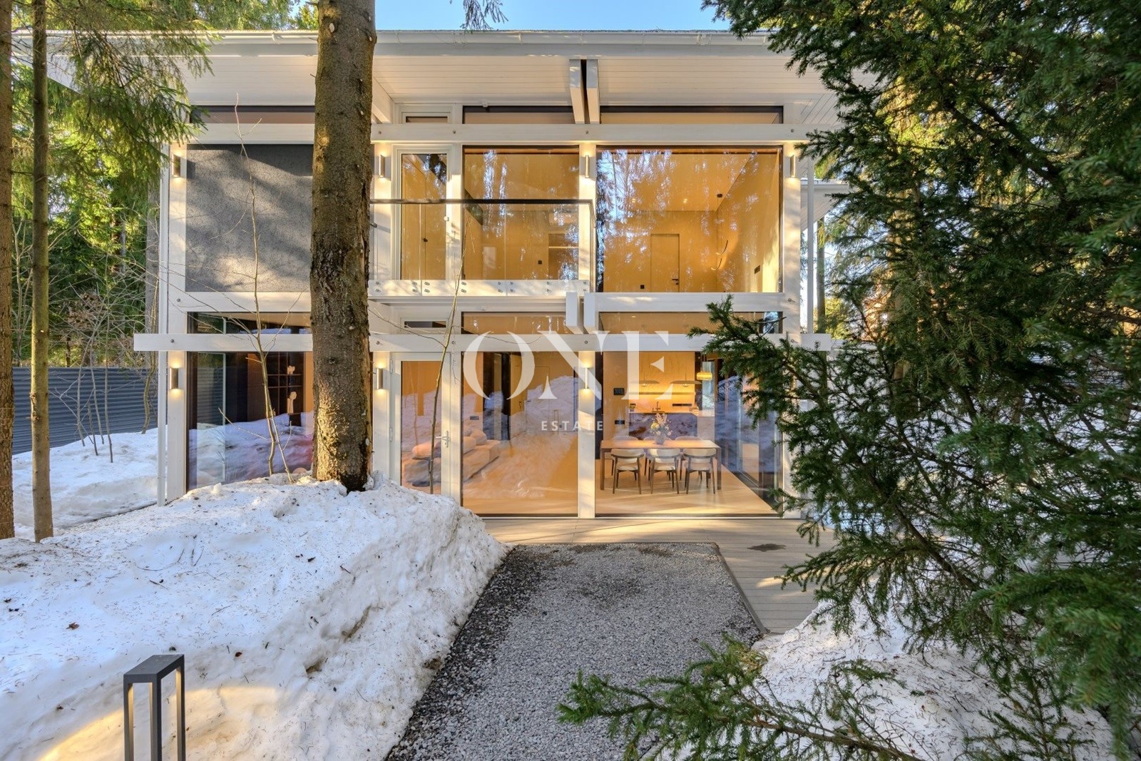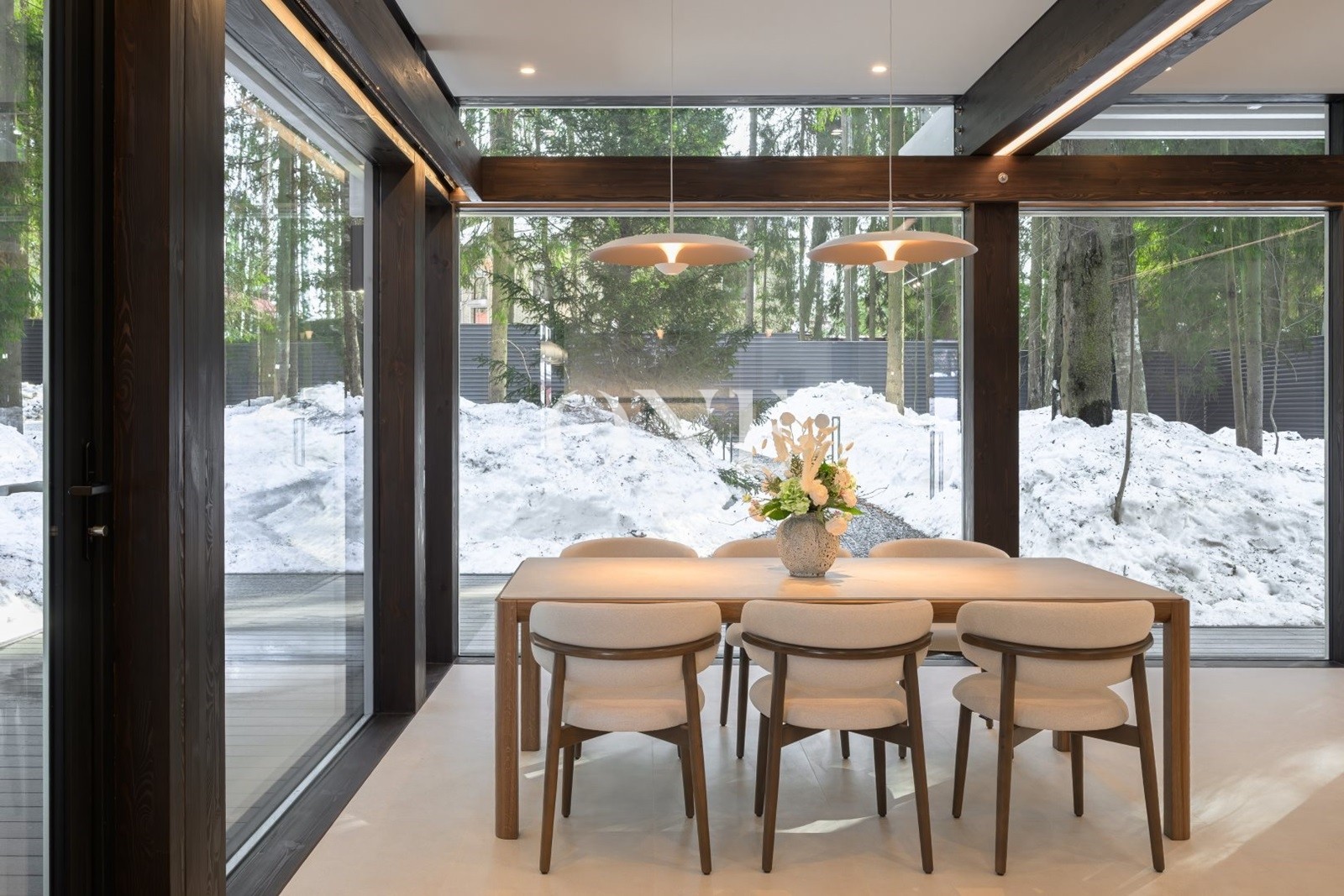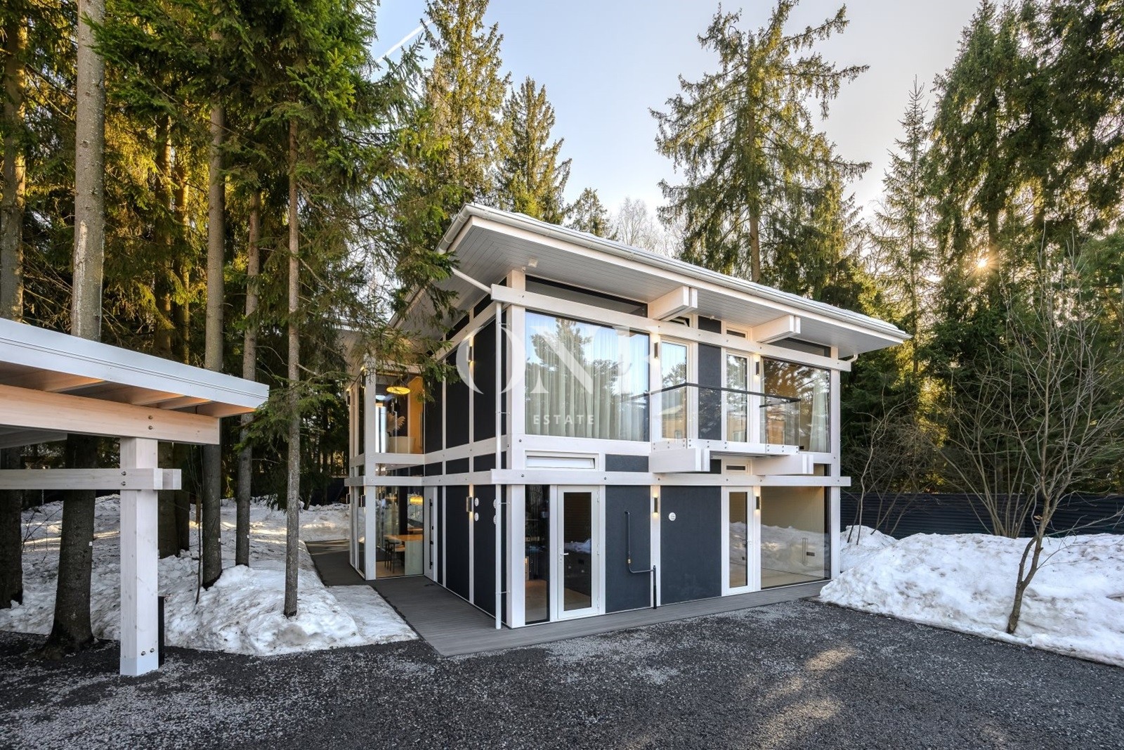 На участке 13 соток растут многолетние ели и дубы, оборудованы костровая зона, просторное патио с выходами из гостиной и кухни, праздничная иллюминация в лесу и декоративные