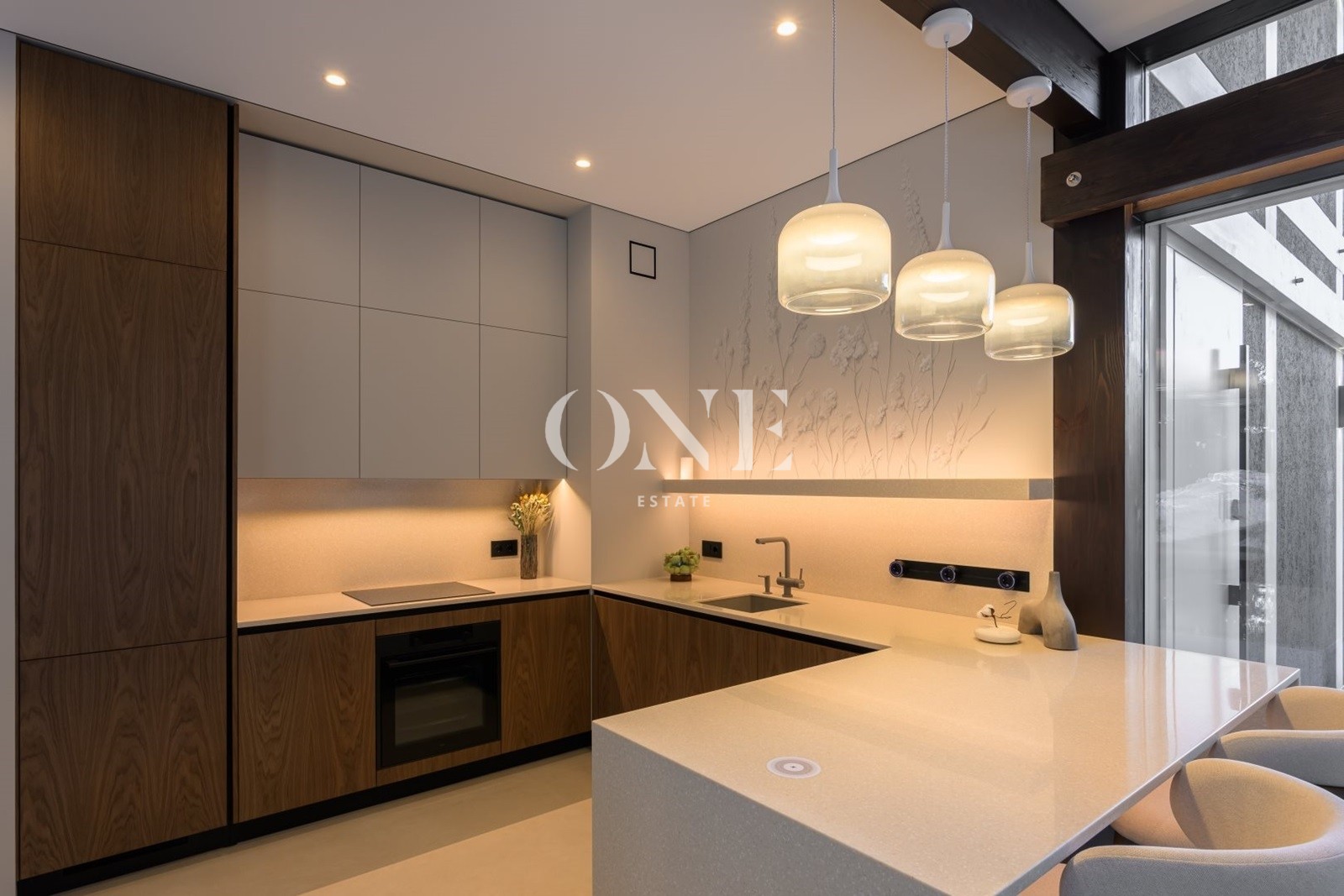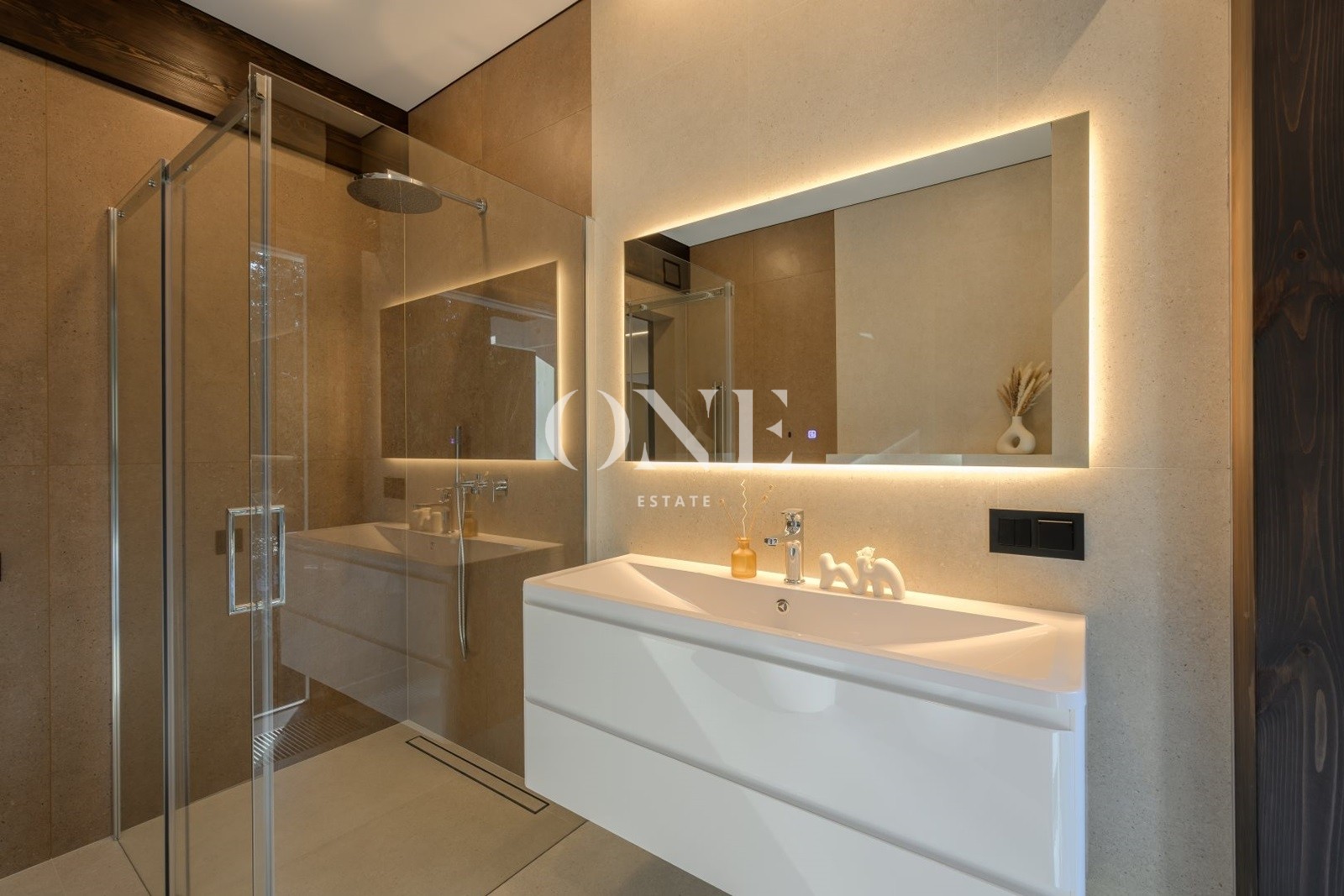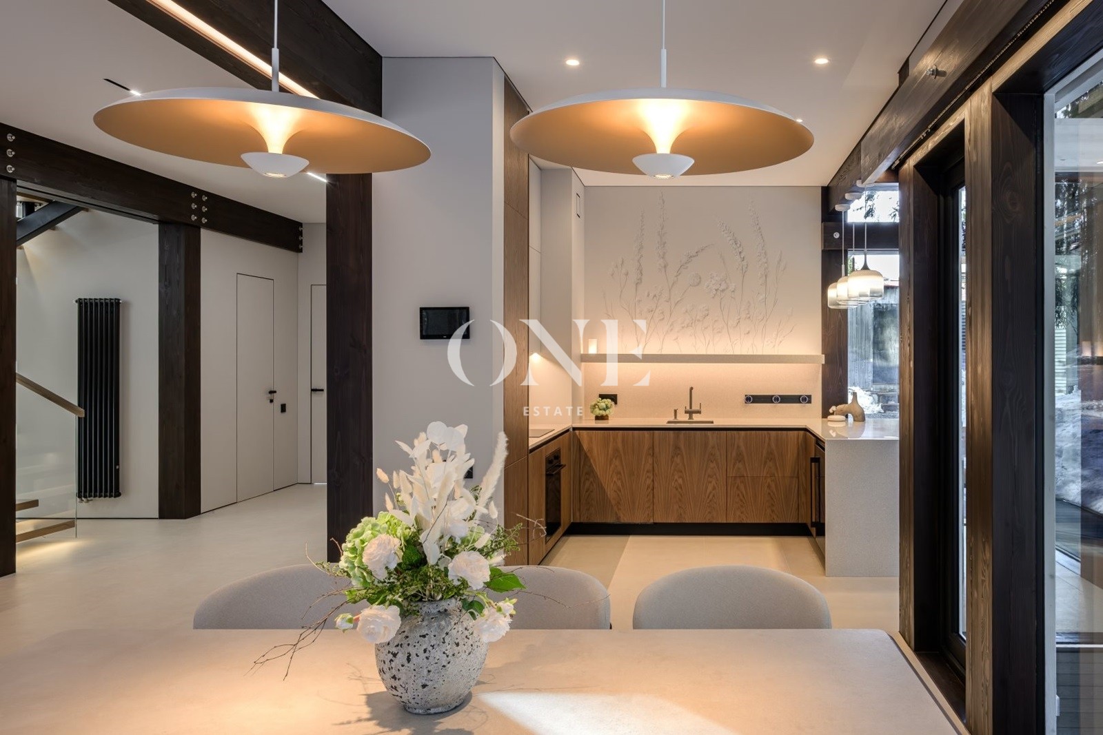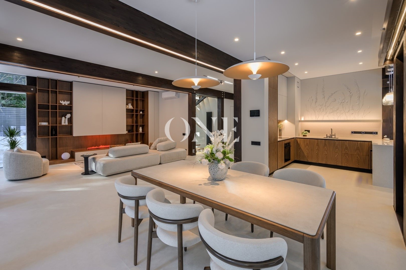 На участке 13 соток растут многолетние ели и дубы, оборудованы костровая зона, просторное патио с выходами из гостиной и кухни, праздничная иллюминация в лесу и декоративные
