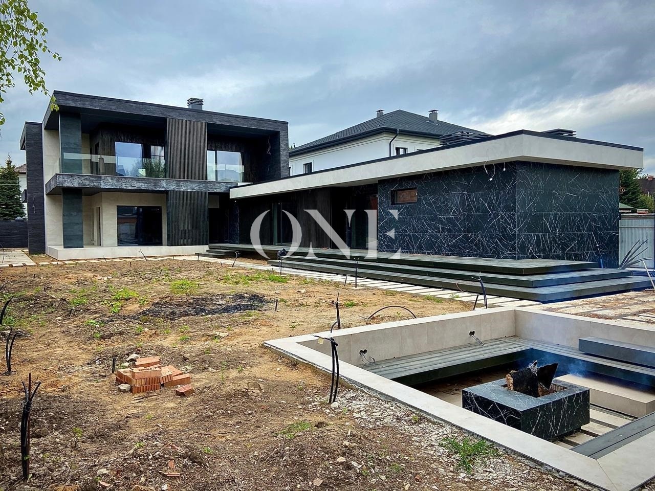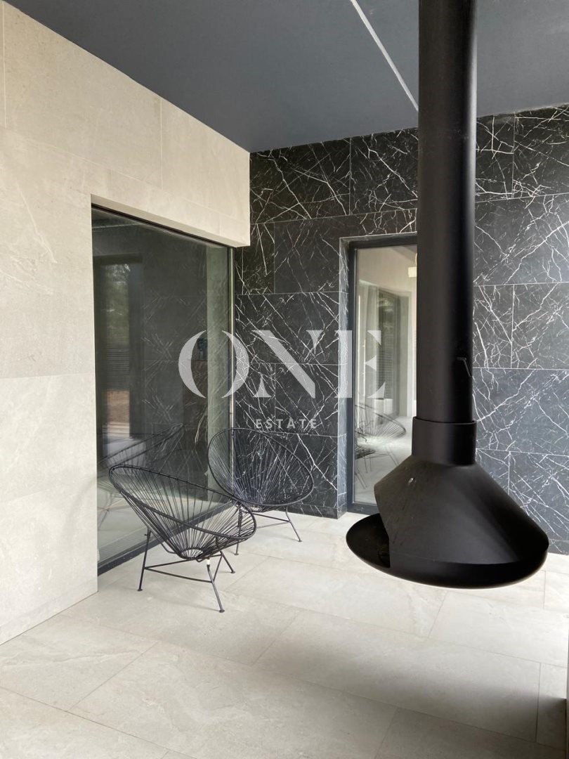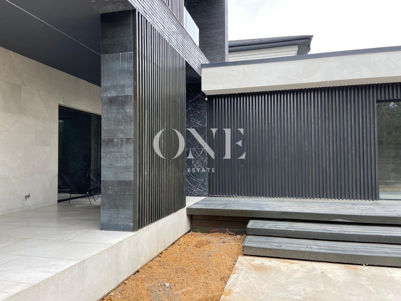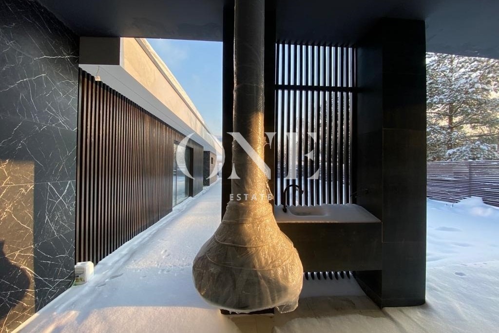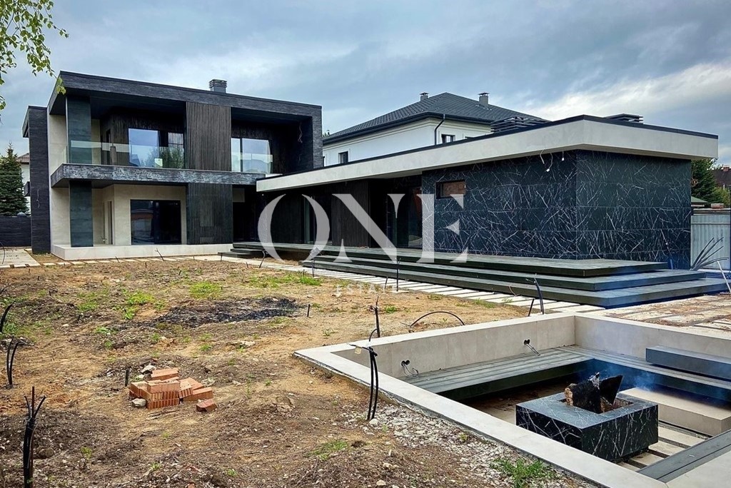 Дом имеет плоскую кровлю, большое панорамное остекление, фасад отделан керамогранитом, ригельным камнем и рейкой из термопихты, этот материал практически не впитывает влагу, не деформируется на солнце. Установлены гаражные ворота компании Alutech - 5,20 м в длину, что обеспечивает удобный заезд под навес на территорию участка. Фундамент выполнен из монолитного железобетона, так же как и несущие конструкции дома: колонны и все межэтажные перекрытия. Высота потолков - 3,3 -3,55 м Плоская крыша отделана ПВХ мембраной с утеплением и разуклонкой, внутренние воронки подогреваемые, вся вода переливается в ливневую канализацию. Окна - теплый алюминий, также установлен раздвижной портал в гостиной с выходом на крытую террасу с дровяным камином. Все санузлы оснащены скрытыми душевыми системами, скрытыми смесителями, душевыми трапами, инсталляциями под подвесные унитазы. Запроектирована - система УМНЫЙ ДОМ и смонтированы выводы под: Видеонаблюдение Пульты и панели управления умного дома Пожарные датчики Датчики движения Датчики протечки воды Датчиками сигнализации Бесшовный Wi - Fi Электровыводы для штор. Участок 10 соток, правильной прямоугольной формы. На участке сделаны выводы для автополива, электровыводы для светильников вдоль дорожек, для подсветки деревьев. По самому дому также есть выводы, установлены профиля для контурной подсветки по свесам крыши и по контуру цоколя. Обустроена костровая зона с розетками и подсветкой.