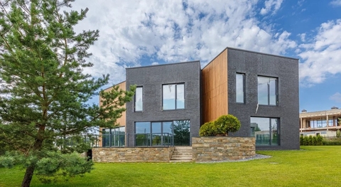 В дизайне домов преобладают чёткие геометрические линии, простые формы, объем и пространство. Это лёгкие и надёжные конструкции из бетона, стекла и ценных пород дерева. Благодаря большим окнам в коттеджах много света.