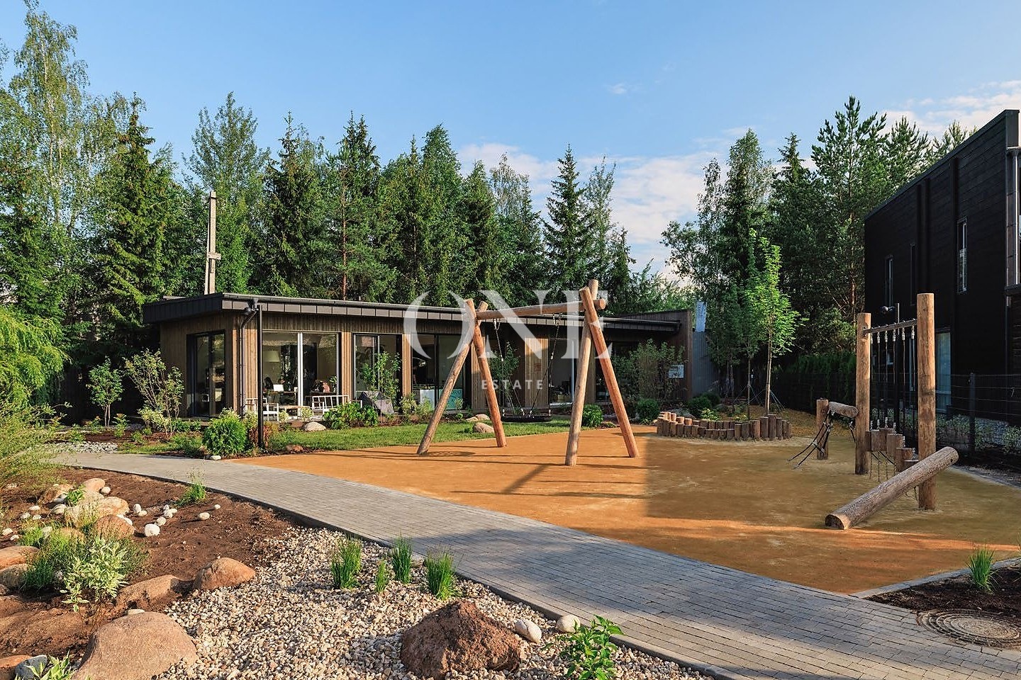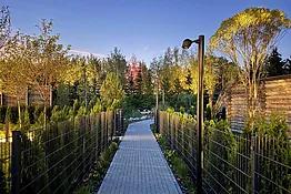 По территории проложена сетка пешеходных тропинок с покрытием из клинкерного кирпича, имитирующим состаренную брусчатку. Вся инфраструктура поселка: зоны отдыха, дорожки, озеленение, продуманы до мелочей в целях создания идеального комфорта и приватности.