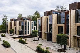 Линейная геометрия фасадов подчеркнута чередованием камня и стекла, объемных и гладких фактур. Во внешней отделке домов используются натуральный камень, клинкерная плитка и шпонированные панели, имитирующие природные материалы.