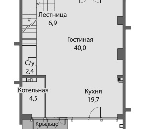 1 этаж: гостиная, совмещенная с кухней и выходом на террасу, с/у, котельная;
