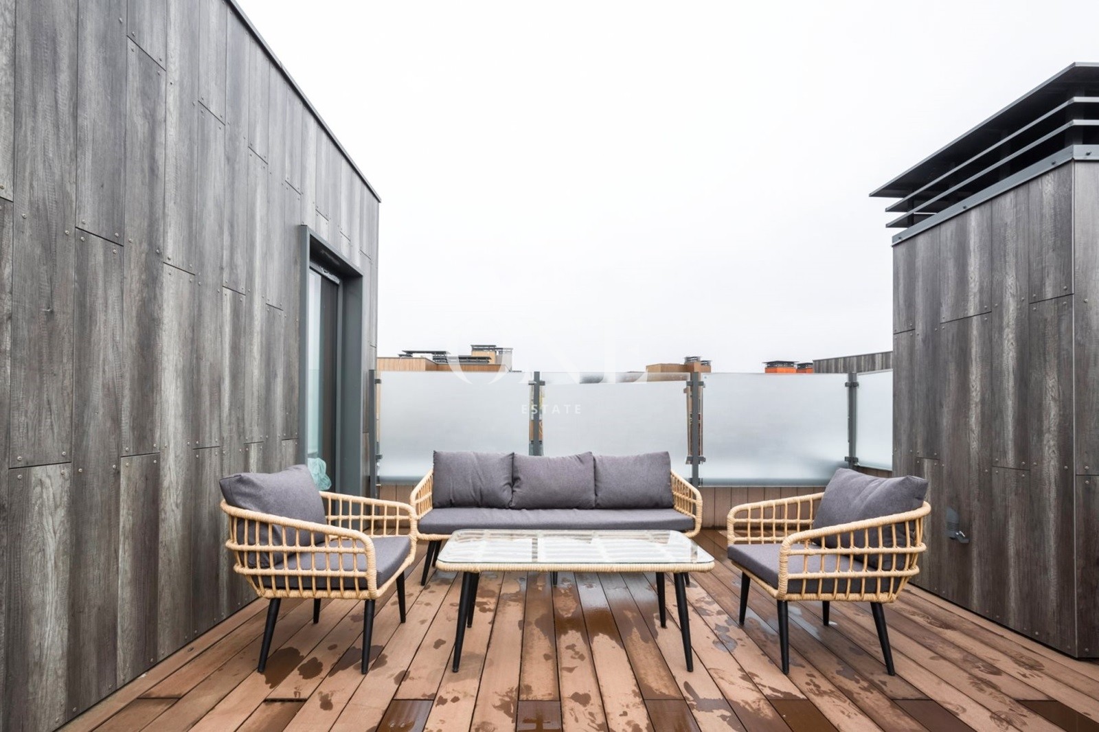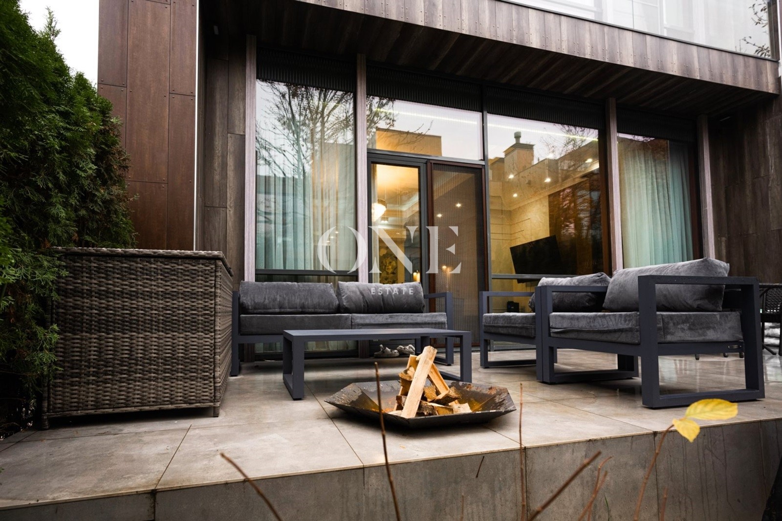 На участке за домом расположена уютная зона патио в окружении туй, а терраса на крыше — превосходное пространство для отдыха: утренний кофе, вечерние встречи или спокойная пауза в тишине.
