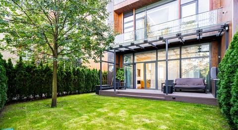 Для летнего отдыха в таунхаусе — просторная открытая терраса, которая выходит во внутренний двор, укрытый от взглядов посторонних густой стеной деревьев. На балконы, где можно выпить утренний кофе, выходят две комнаты.